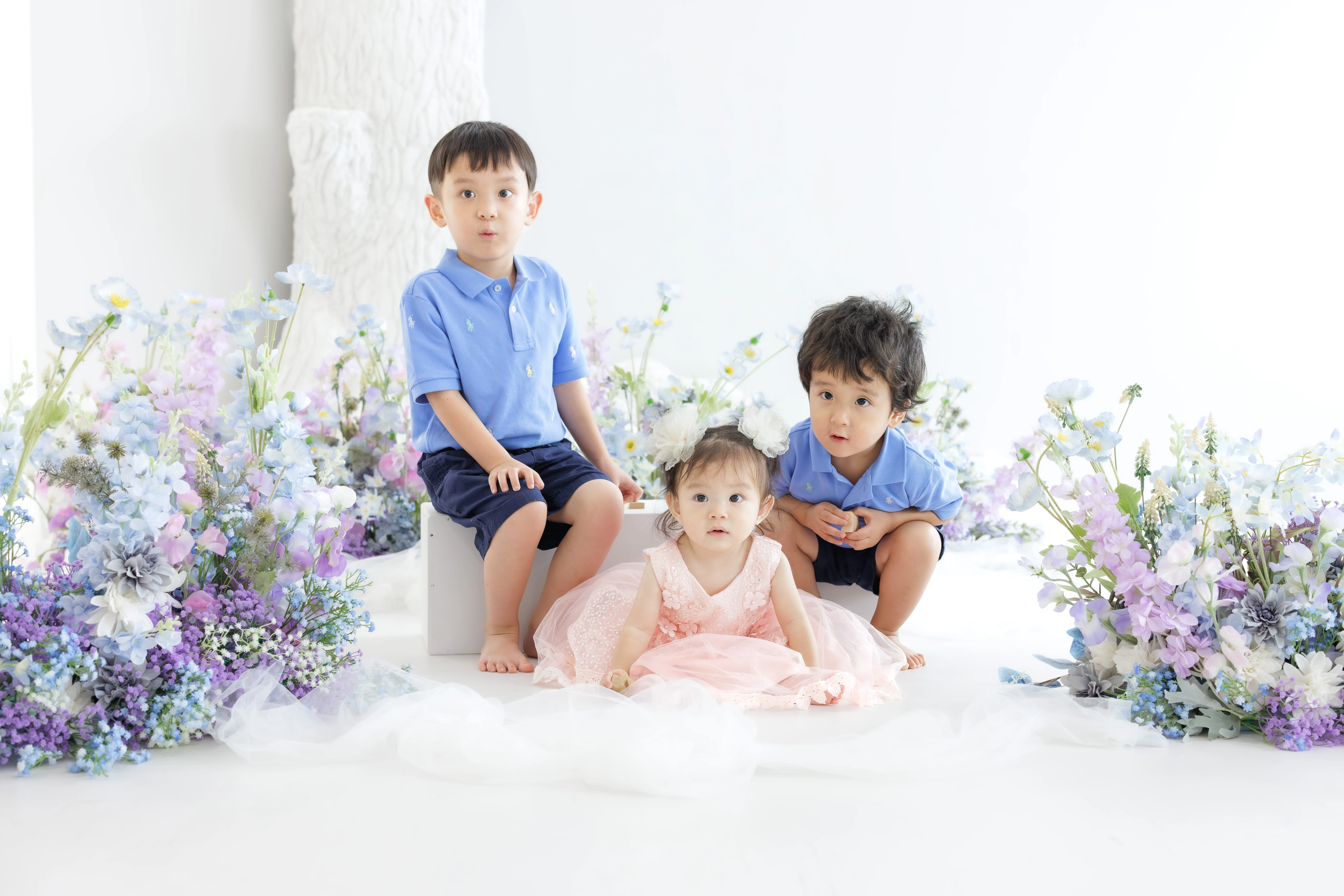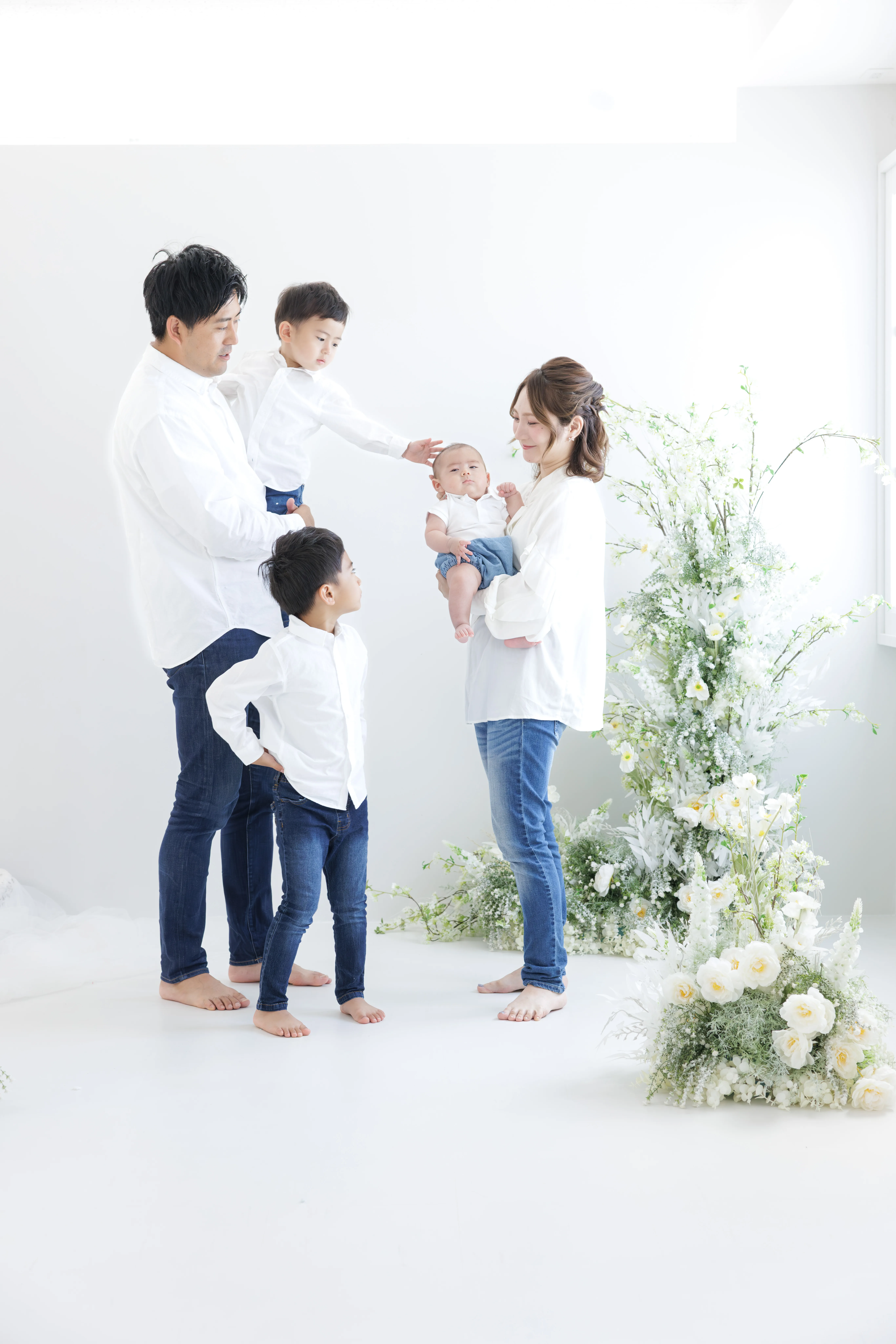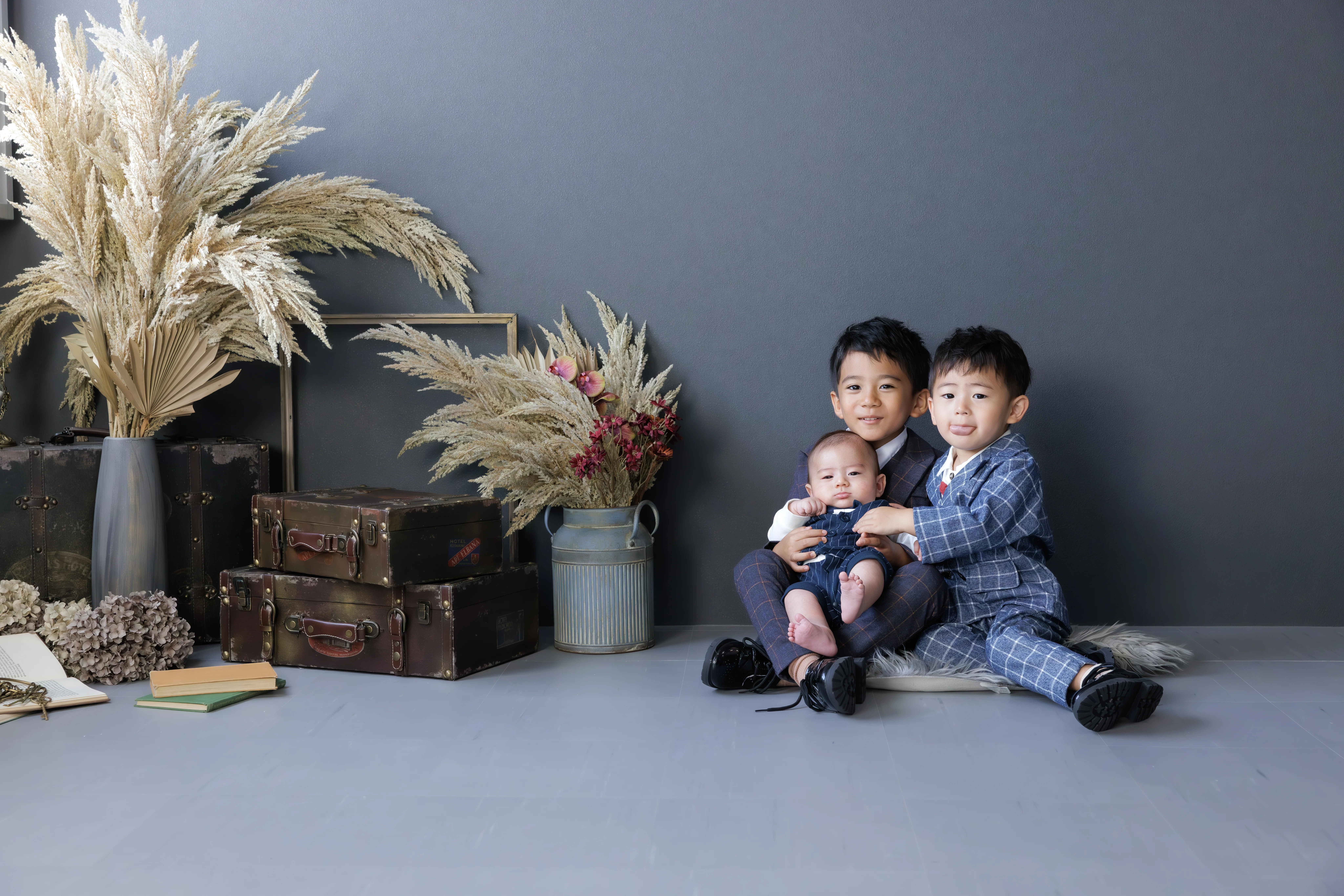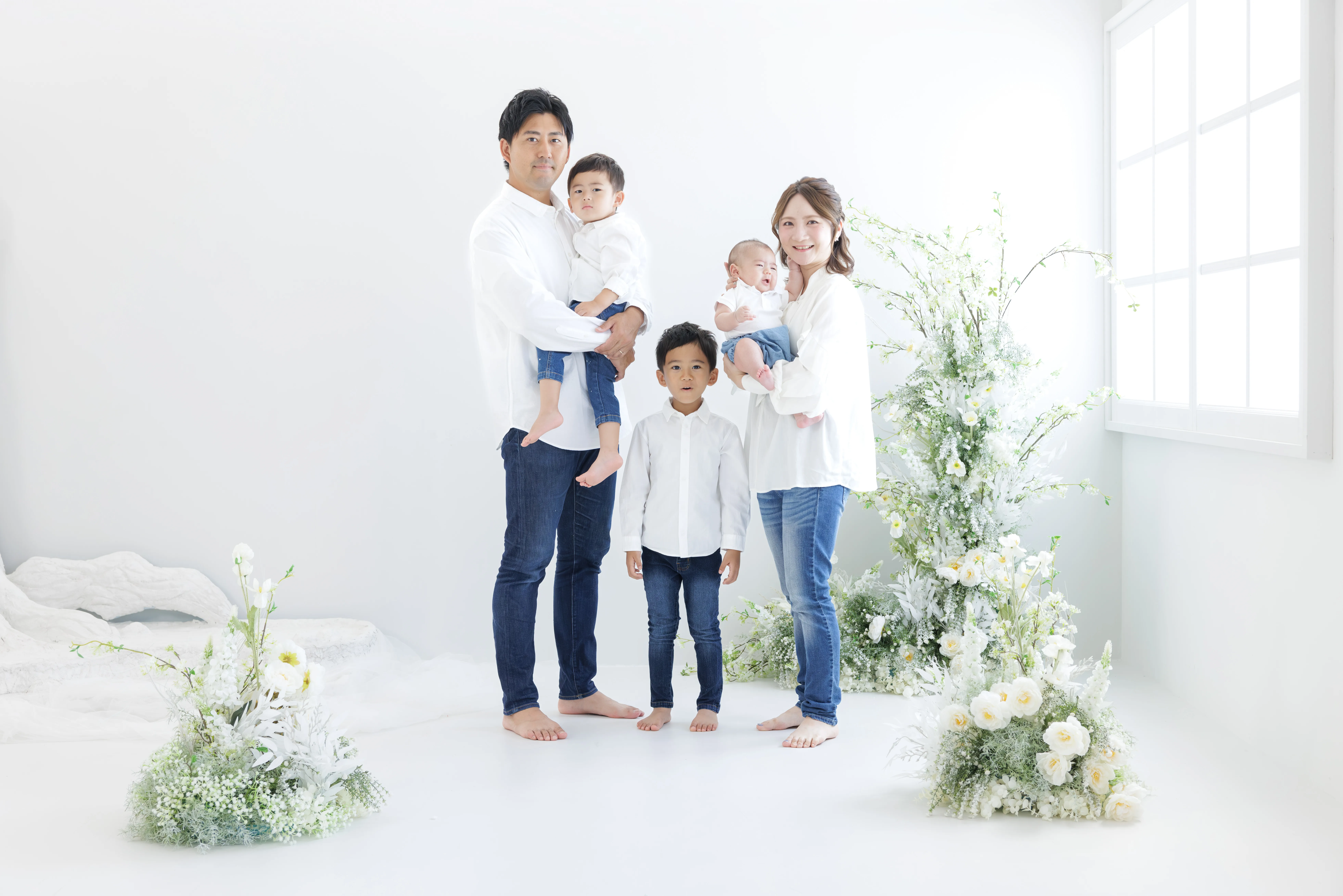 - シンプルでおしゃれなスタジオ:白やグレーを基調とした背景で、ご家族が主役になる写真を残せます。