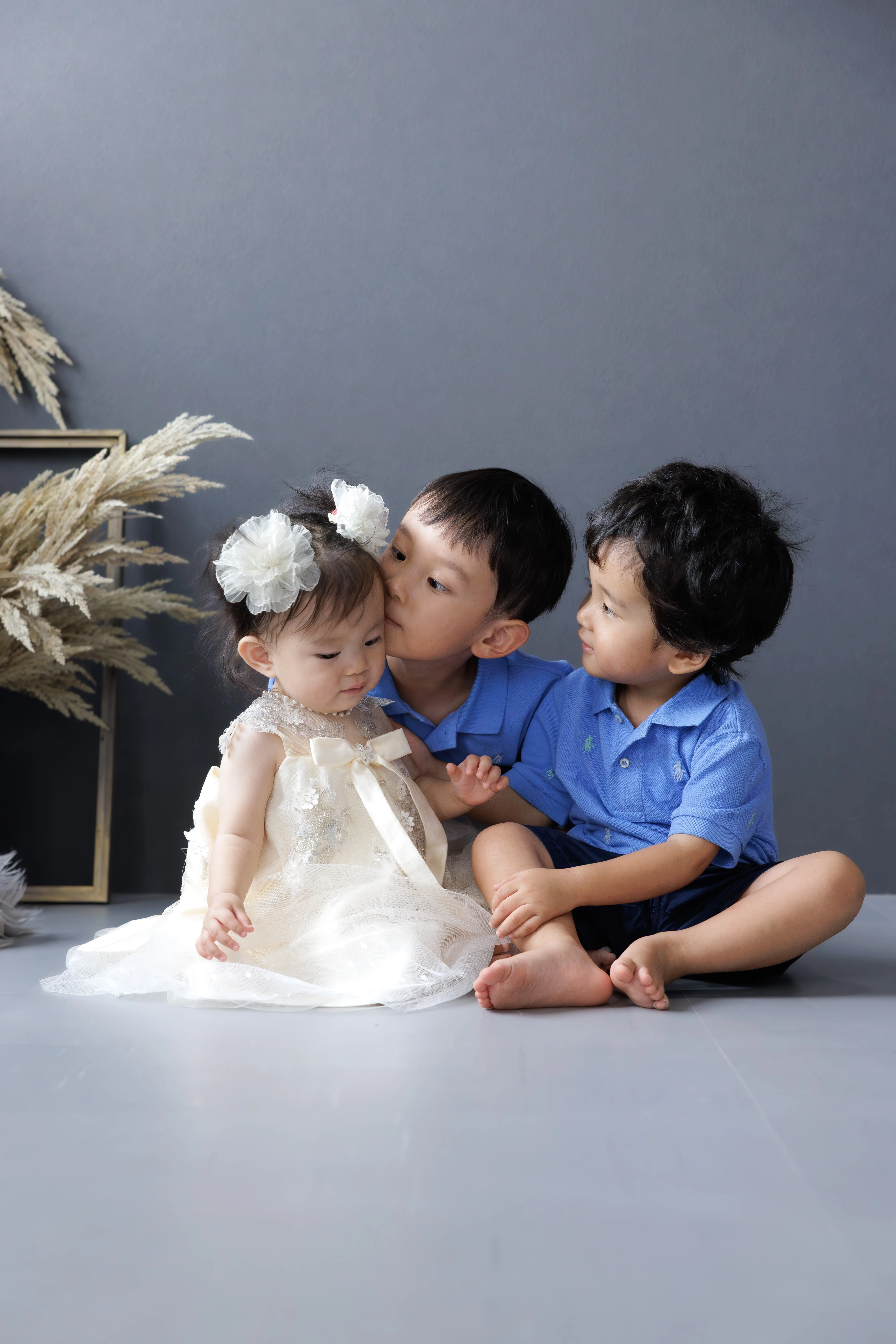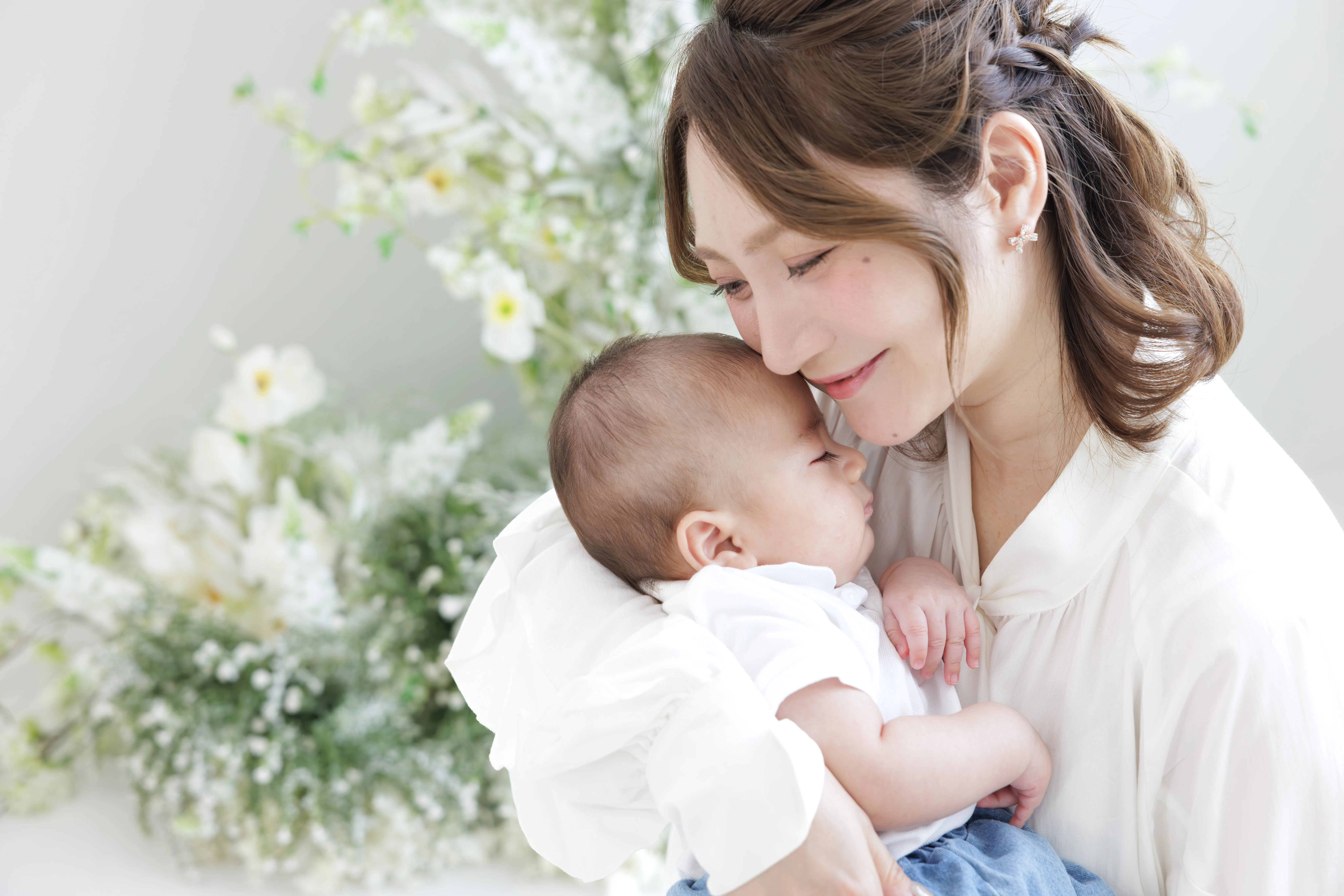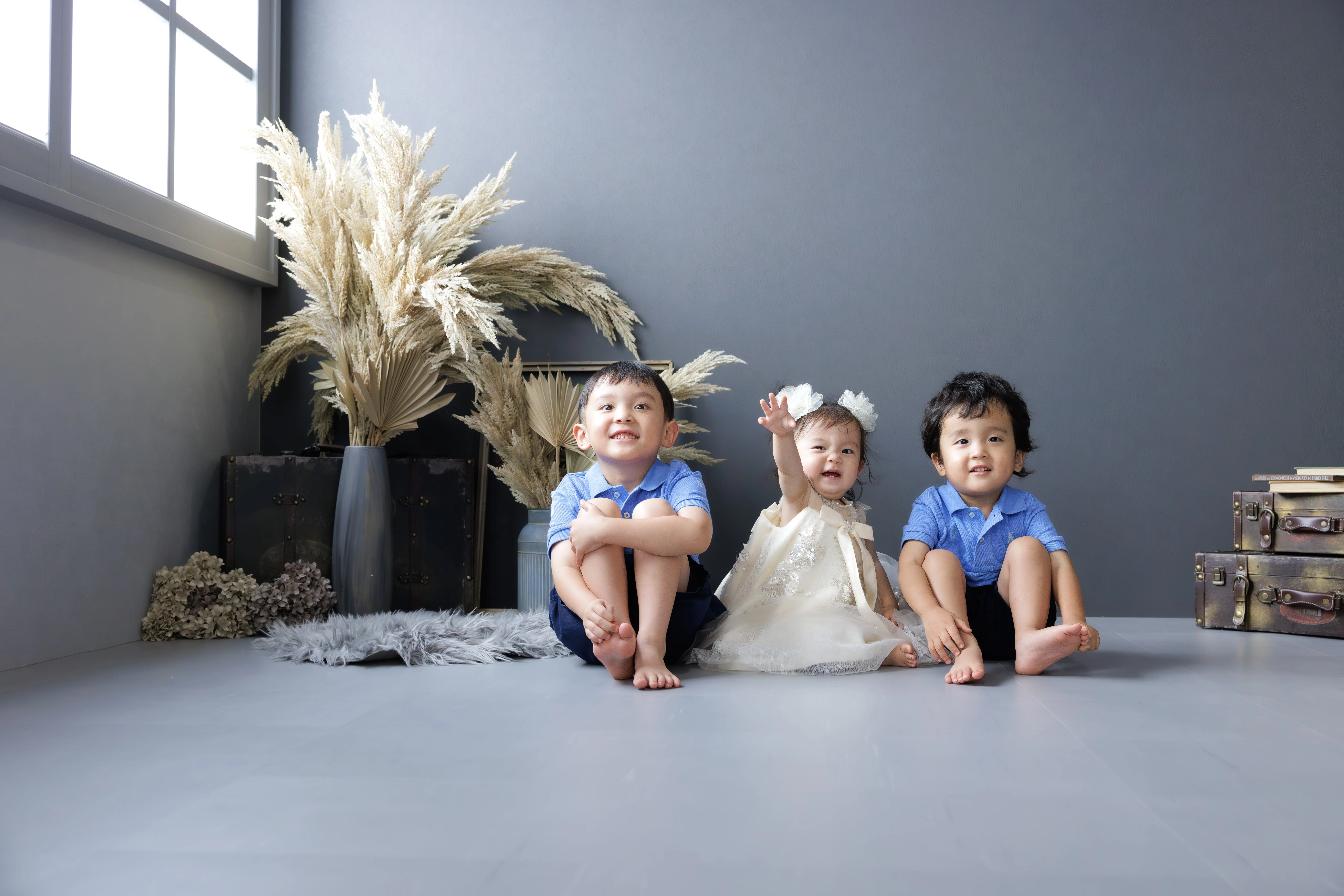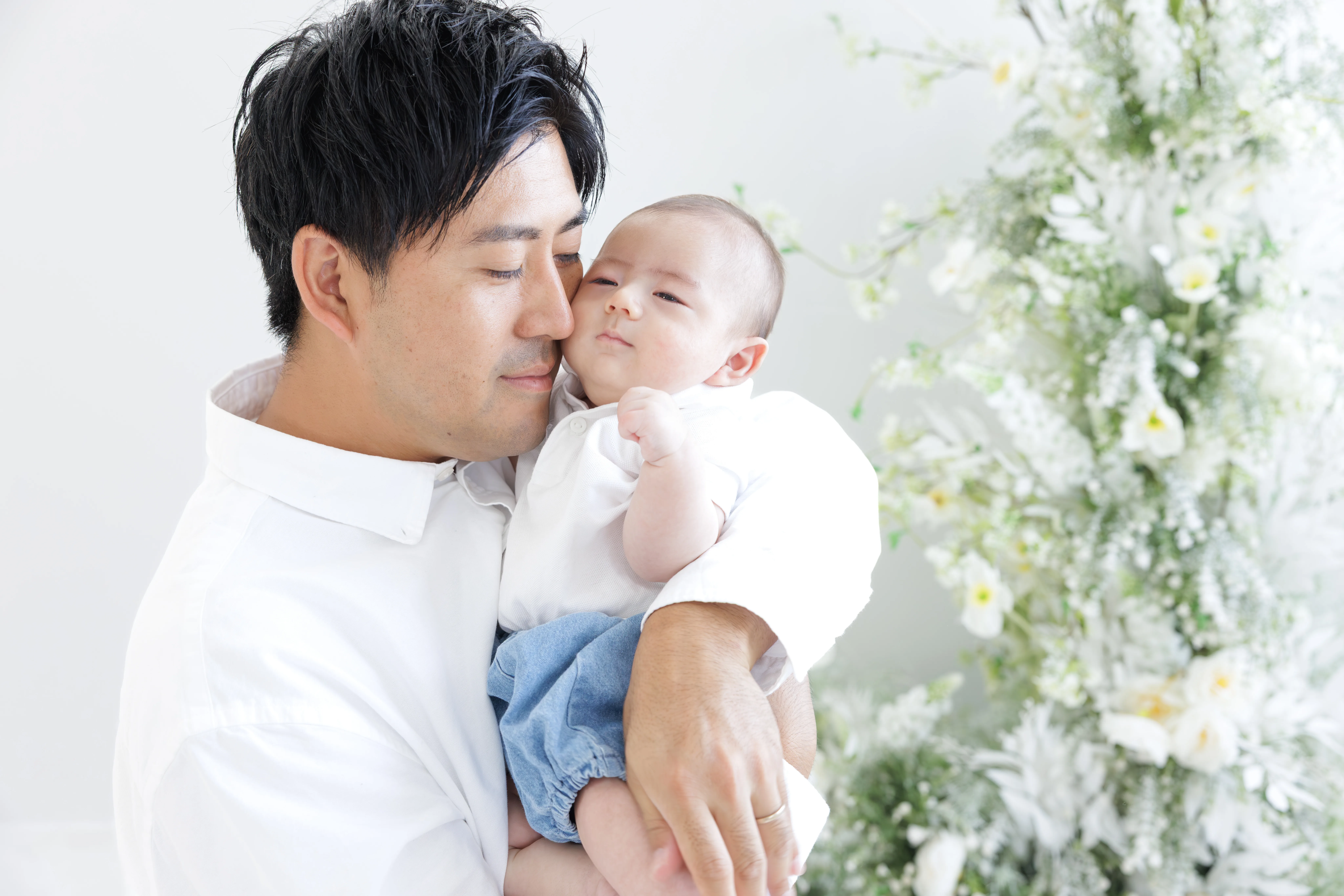 - シンプルでおしゃれなスタジオ:白やグレーを基調とした背景で、ご家族が主役になる写真を残せます。